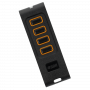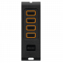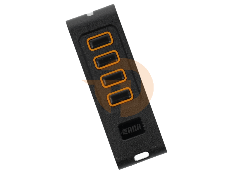 Moderne 4-kanaals handzender in een stijlvol design met 4 drukknoppen, aluminium zijkanten, en oranje LED.
